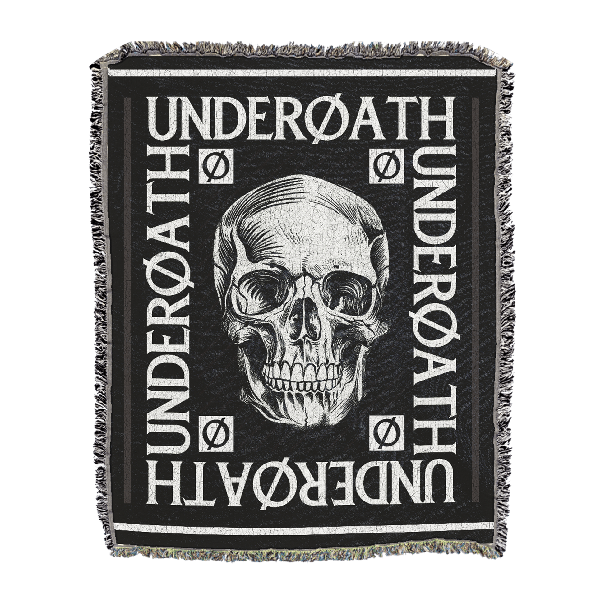 Jacquard knitted blanket with skull graphic and frame of repeating logos