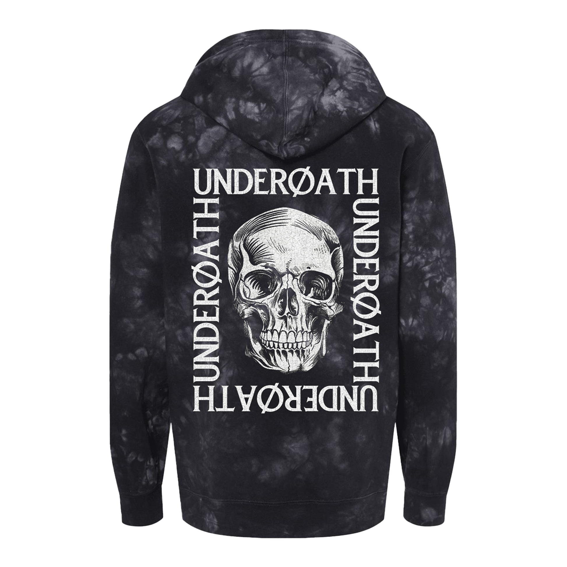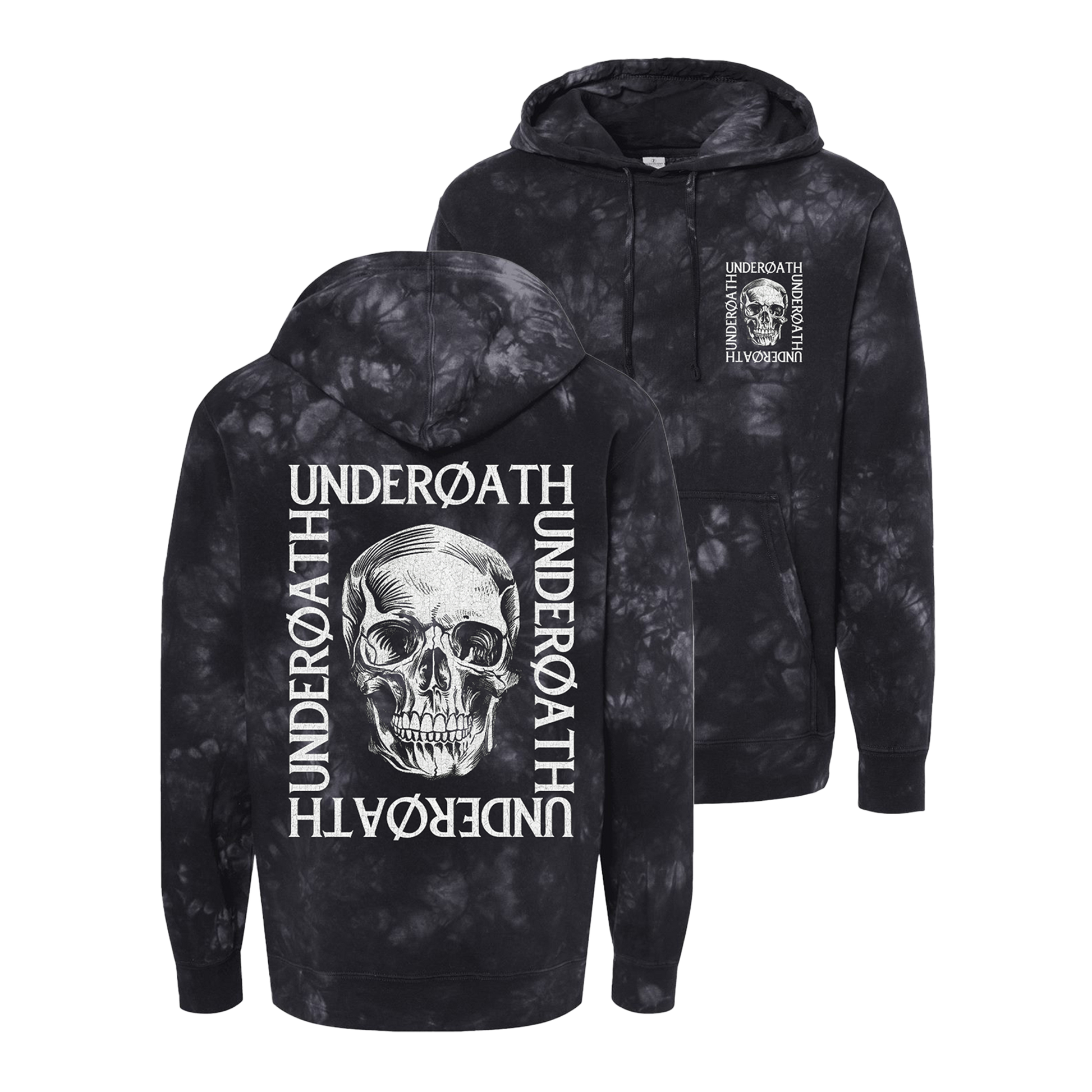 Black tie-dyed pullover hoodie with skull design on the front left chest and back.